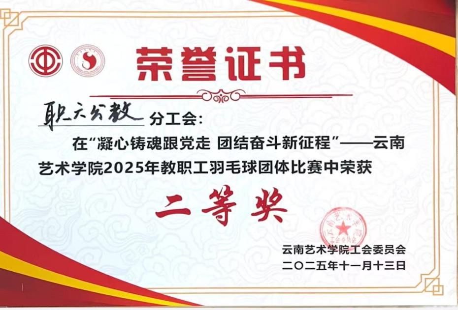 为积极响应云南艺术学院工会“凝心铸魂跟党走 团结奋斗新征程”2025年教职工羽毛球团体比赛的号召,丰富教职工文化生活,增强团队凝聚力,公共教学部分工会高度重视,精心组织,与学校职能六首次联合组队参赛。在为期四天(2025年11月10日至11月13日)的激烈角逐中,联队队员们团结协作、奋勇拼搏,最终成功闯入前三名,荣获团体二等奖,取得了骄人成绩。